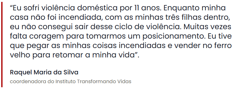 Uma dessas entidades é o Instituto Transformando Vidas, que oferece cursos profissionalizantes gratuitos para moradores de três comunidades na região de Venda Nova, em Belo Horizonte. A coordenadora do projeto social, Raquel Maria da Silva, ela própria uma vítima de violência doméstica, deu testemunho pessoal para ilustrar a importância da conscientização das mulheres sobre seus direitos.